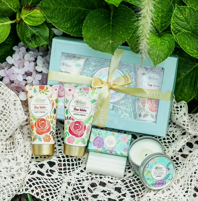 4PC Rosewater Gift Box: Hand & Foot Cream, Soap, Scented Candle – All Skin Care Needs