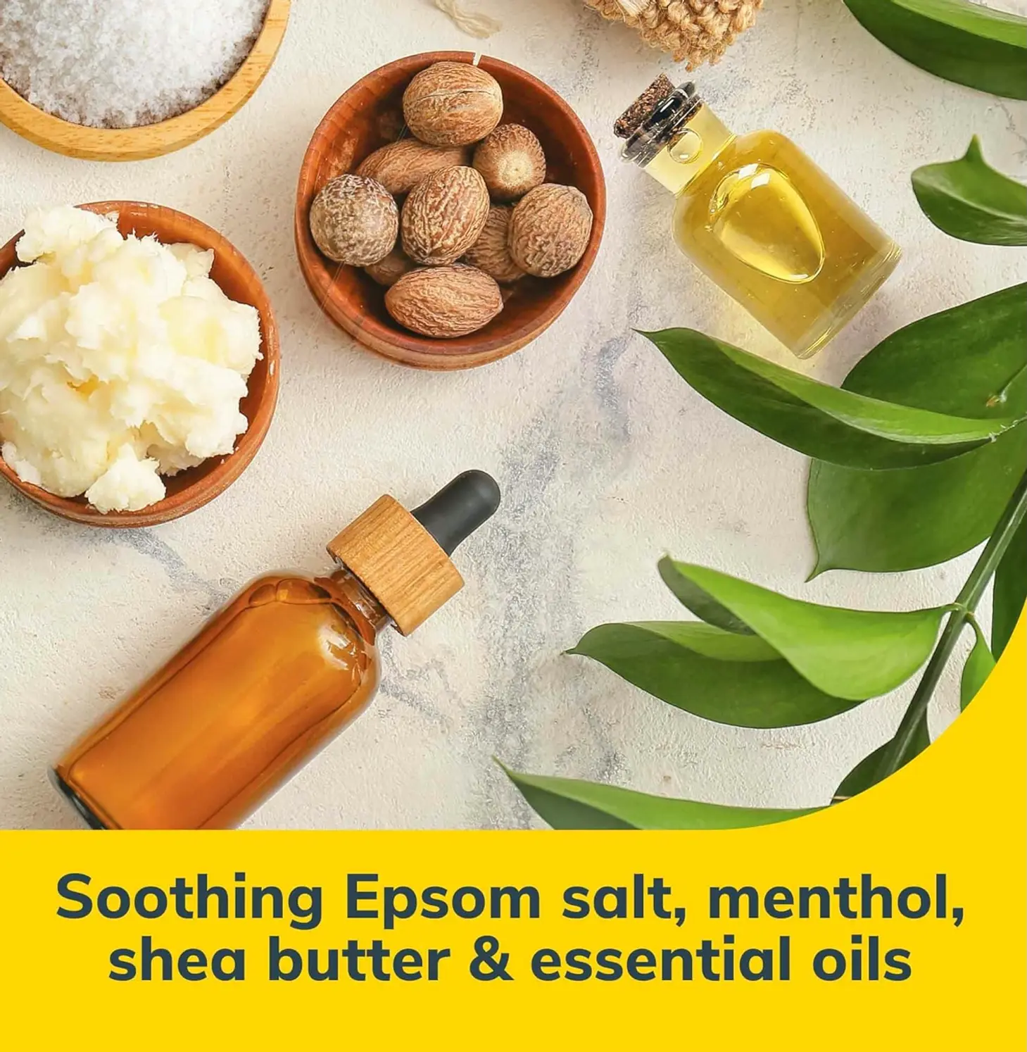 Self-warming to relax tired feet. Penetrates deeply to tissues of the feet. Gives fast, lasting relief. Includes Magnesium sulfate for sore feet. Infused with Shea butter to thoroughly moisturize.