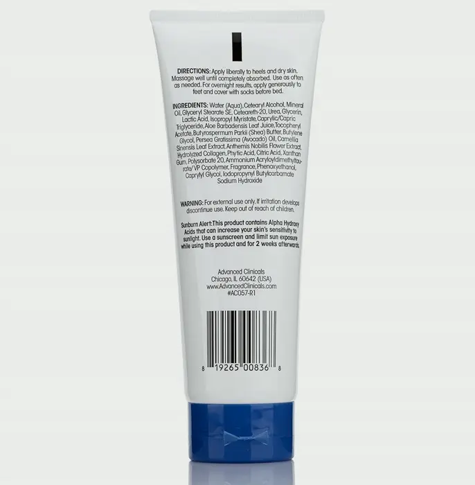 Address problem areas directly while hydrating and revitalizing your skin. Hydrating lotion helps with dry feet, cracked heels, calluses, and rough spots. Expertly crafted to soothe cracked, roughened skin using Shea Butter to keep feet moisturized, smooth, and nourished. Cracked heel repair cream will immediately leave your feet feeling soft. Can be used as hand lotion or spread to rough spots on arms, knees, or feet. Lactic Acid sloughs away dry, dead skin cells while Avocado Oil and Shea Butter soften calluses for renewed and improved soft feet. Aloe vera soothes irritated dry skin. Revive dry and cracked feet overnight with the help from Advanced Clinicals Cracked Heel treatment Cream. Advanced Clinicals cracked heel lotion can be used with a foot scraper or socks to provide the ultimate spa-like experience. Apply your favorite foot oil initially, then apply the cream. Can be used both morning and night for best outcomes. Paraben-free. Trusted formula. Manufactured in the USA. Not tested on animals. 100% Satisfaction Guaranteed.