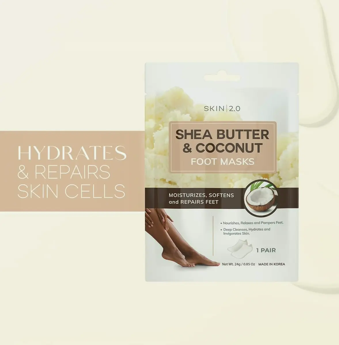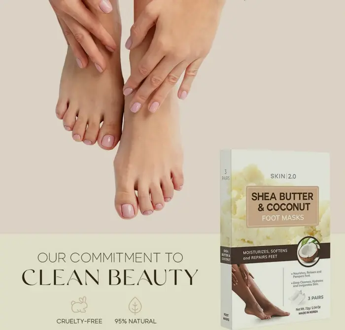 Our Foot Mask with Shea Butter and Coconut delivers deep moisture to parched and cracked soles, revitalizing hydration and making them soft and supple. It replenishes and soothes, offering your feet the pampering they need. The luxurious combination of Shea butter and coconut oil moisturizes and conditions the skin, aiding to enhance the texture and appearance of your soles. Indulge in a moment of relaxation with our foot mask. The soothing ingredients of Shea butter and coconut offer a calming feeling, relieving stress and exhaustion whilst promoting a sense of wellness. Produced in South Korea, our feet wrap is the renowned in skincare quality. Designed for convenience, this product is simple to apply. Simply slip it on, and let it work its magic. Rest for the suggested time, then remove the mask to show rejuvenated, moisturized, and smooth feet. If you face any problems using Skin 2.0 Feet Wrap, reach out at any time for help from our skincare specialists. If you’re not completely satisfied, we will repay you in full.
