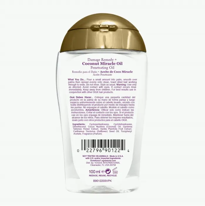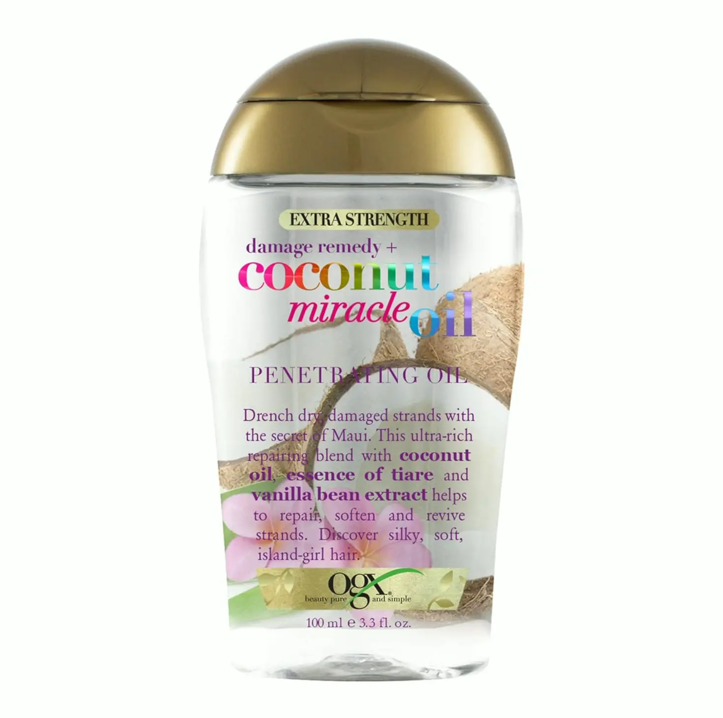 Revitalize & repair parched, coarse tresses with high-strength miracle oil hair treatment. Ideal for average to rough hair textures, the hydrating oil calms frizz & tames stray hairs for silky locks. Transform your hair with OGX premium treatment, which hydrates dry, coarse hair to perfection. Anti-frizz nourishing oil contains with miracle oil, vanilla bean extract, and tiare essence. Makes hair smelling great with coconut fragrance, tangerine, and vanilla notes. Sulfate-free and gentle on coarse hair types, leaves locks revived and rejuvenated.