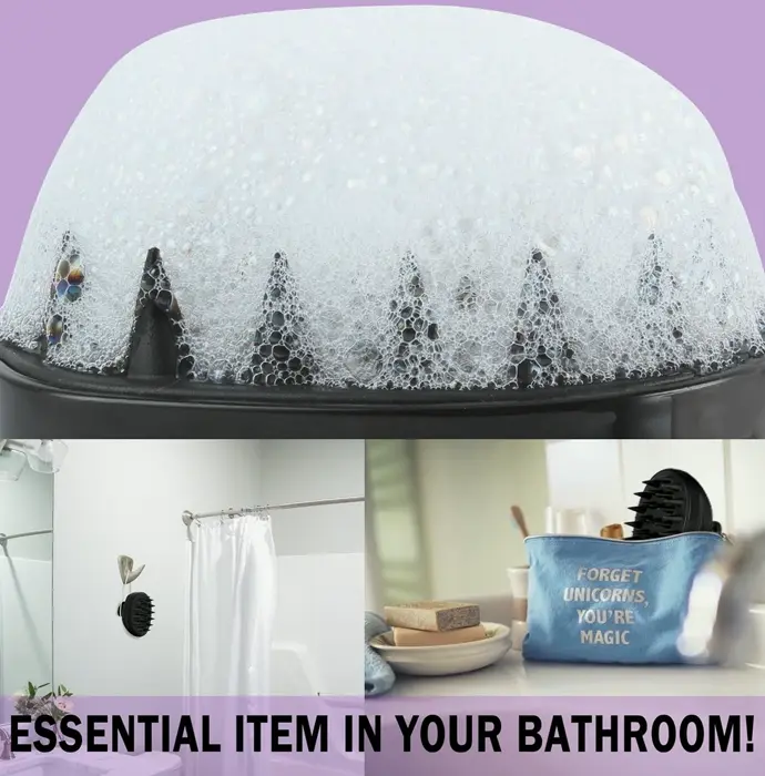 SOFT ON SKIN, REMOVES BUILD-UP: This scalp cleaner brush is made of flexible soft tips which are gentle enough to not pull your hair yet firm enough to provide a great massage and ample lather for deep cleansing. INTENSE CLEAN: This tool efficiently removes build-up of hair products and dead skin which leads to scalp issues. More efficient than using fingers. GENTLE SCALP MASSAGER: Boosts blood circulation, reduces dandruff, soothes irritation and aids hair growth. VERSATILE FUNCTION: Perfect for shower use or dry massaging, great for itch relief. Professional-quality experience in your bathroom. FAMILY-FRIENDLY: Favored by all ages, even suitable for pets. Refreshing and clear, soothing.