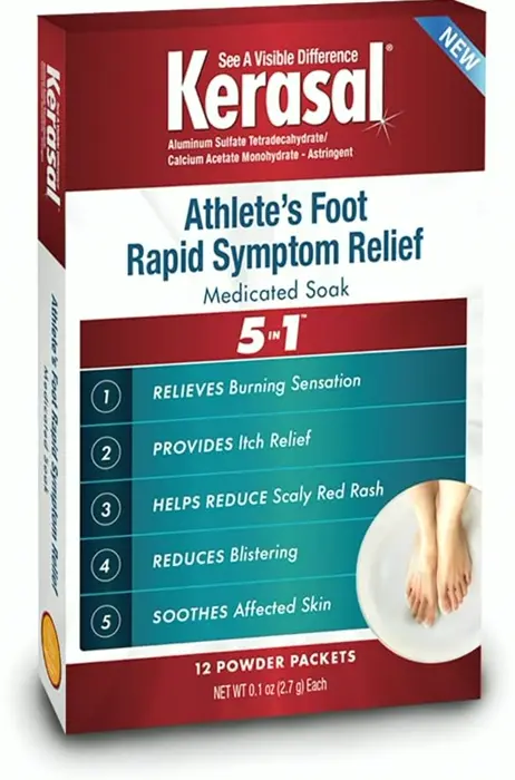 One pack of 12 packets of Kerasal’s Athlete’s Foot Healing Foot Bath. Athlete’s foot treatment solution helps deliver fast itchy skin, alleviates rashes and blistering, and eases warm sensation. Athlete’s foot soak made with aluminum sulfate and calcium acetate monohydrate for powerful astringent properties. Rash calm recipe works to rapidly relieve symptoms of athlete’s foot. Calming and relaxing foot soak, just soak for 15-30 minutes as needed