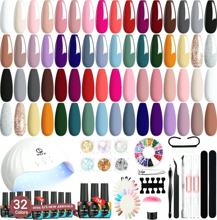 MEFA Brand 56 Pcs Gel Polish Set with UV Light, 32 Colors, Matte/Glossy Top Coats, Nail Art Decorations
