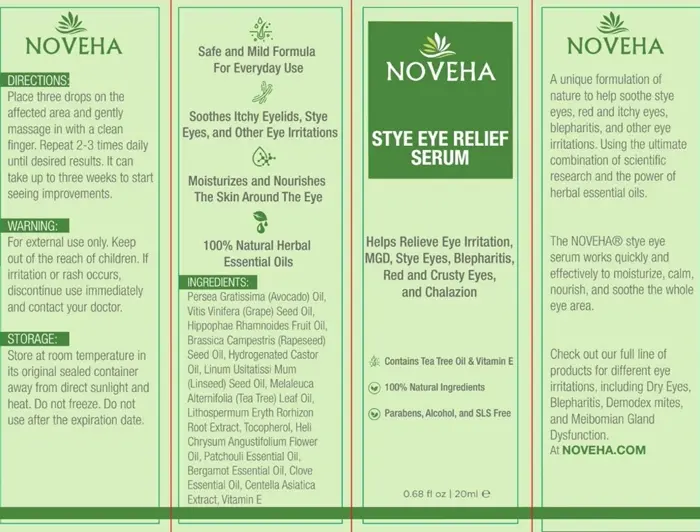 Effective Stye Relief: Quickly soothe eye bumps, irritations, discomfort, chalazion, and other eye issues. Natural Oil Blend: Mixture of 100% pure extracts like Flaxseed, Avocado, Vitis Vinifera, and Melaleuca. Scientifically Formulated: Recommended by Ophthalmologists and Skin Specialists for safe, everyday use. Wide-Ranging Effects: Soothes, cleanses, hydrates, eases itchiness and puffiness, suitable for all types of skin. NOVEHA Assurance: Dedicated to excellence, thoroughly studied and examined for safety and effectiveness.
