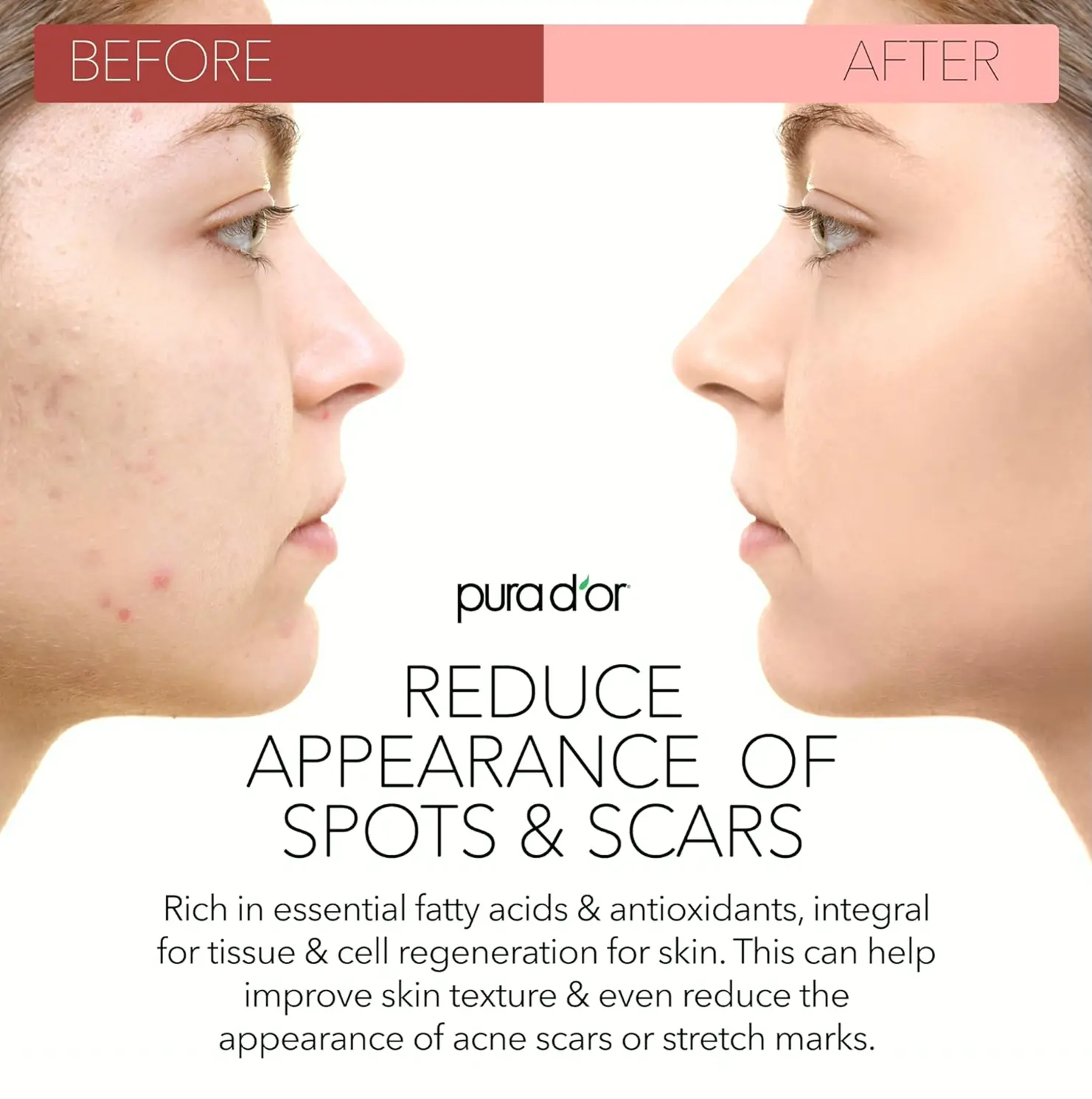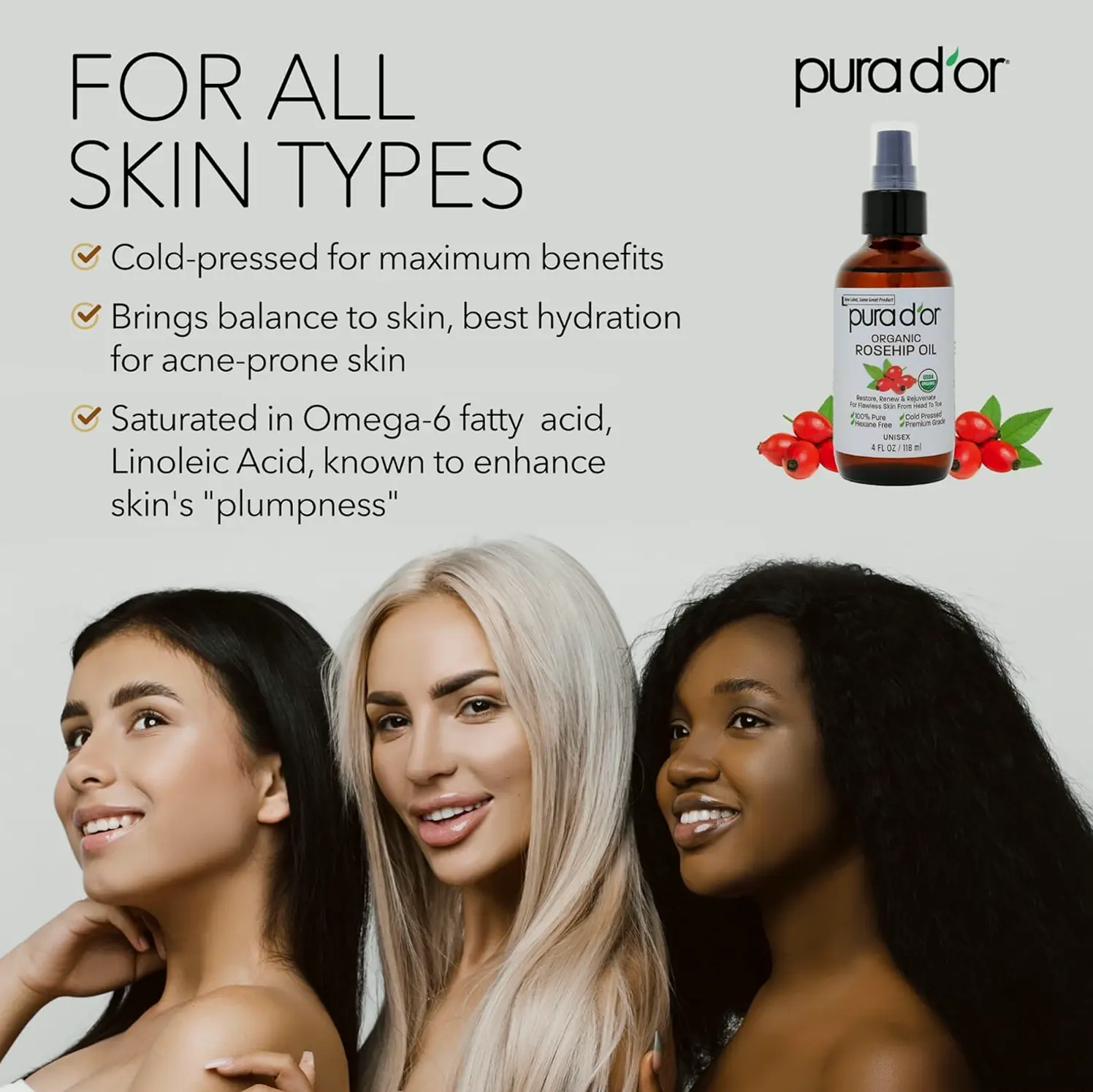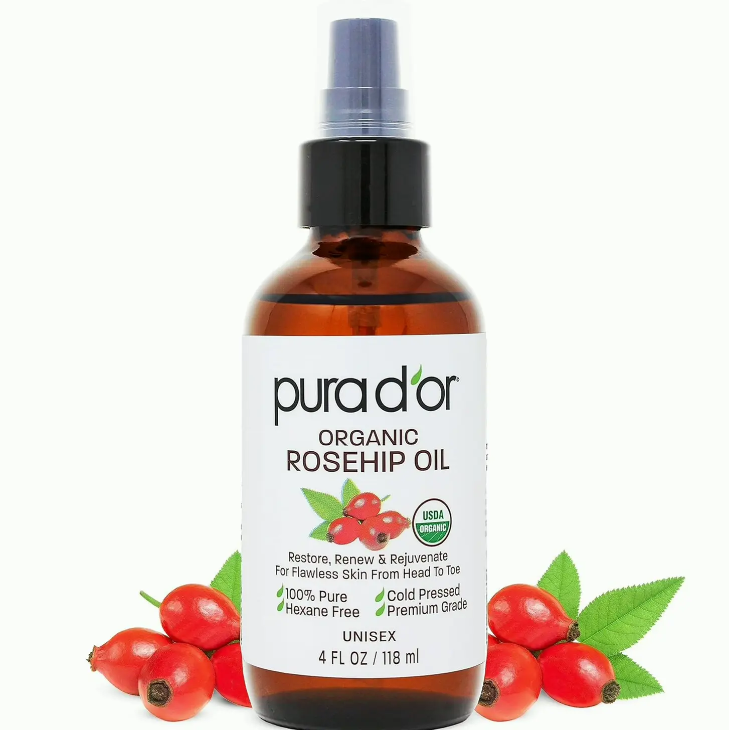 Enjoy the soothing benefits of PURA D’OR Organic Rosehip Seed Oil for relaxing hair, controlling frizz, and smoothing unruly locks free of strong chemicals. This anti-aging serum contains Vit A, Vitamin C, and Retinol to enhance collagen production and reduce wrinkles. Packed with antioxidants and fatty acids, it helps revitalize skin cells, improving texture and reducing acne scars or blemishes. The handy pump guarantees a mess-free application. Our USDA Approved Organic Rosehip Oil is meticulously extracted to preserve all useful compounds.